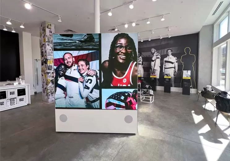 The north wall of the store features a 2.5 mm pixel pitch video wall, measuring 8’10” high x 8’6” wide, delivering over 1.1 million pixels (1080 x 1040) of dynamic visual content. This wall not only showcases brand videos but can also be quickly updated for in-store events, enhancing customer engagement.